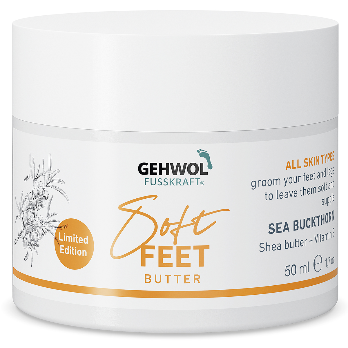 GEHWOL Fusskraft Soft Feet Butter med tindved gir en himmelsk følelse. Den regenererer føttene og styrker huden med Vitamin E. Den rike pleieformelen med sheasmør og avokadoolje gjør huden merkbart smidigere. Glyserin gir nødvendig fuktighet.